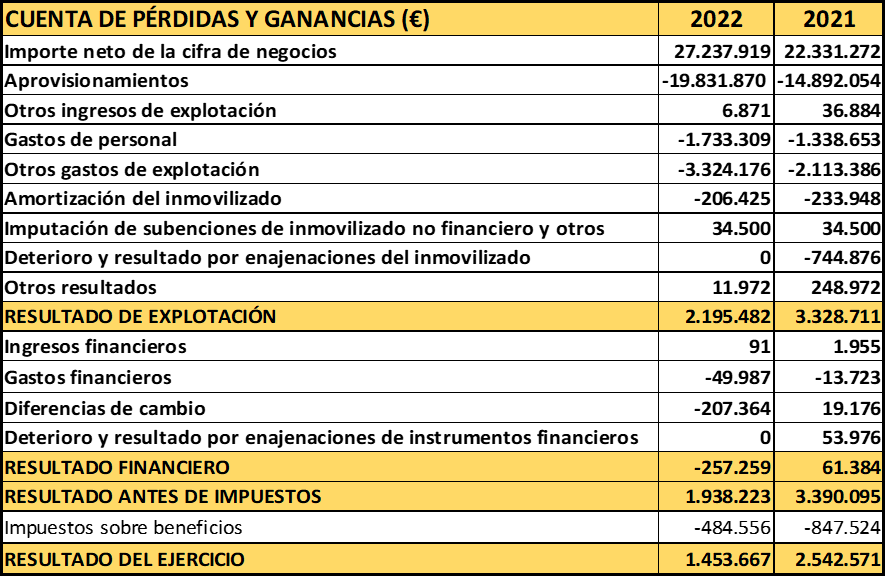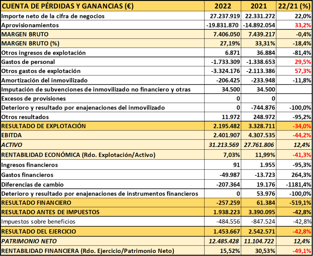 Tal y como indica la tabla, los ingresos por la venta de sus productos menos los costes de venta de dichos artículos, es decir, su margen bruto, es del 27,19% y del 33,31% en 2022 y 2021, respectivamente. Asimismo, notamos que el total de su actividad generó un resultado de 1,4 y 2,5 millones de € en 2022 y 2021, respectivamente. Otra información que podemos extraer de su CPyG (junto con su activo total) es su rentabilidad económica, que presenta unos valores de 7,03% y 11,99% en 2022 y 2021, respectivamente. Además, la CPyG nos informa de más indicadores como el EBITDA o, si tenemos en cuenta el patrimonio neto, de su rentabilidad financiera.