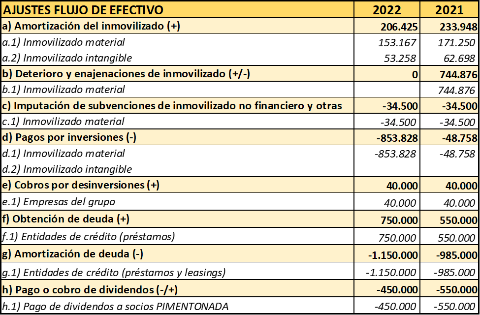 Cabe destacar, que hemos incluido los ajustes (adiciones y eliminaciones) que, en general, nos podemos encontrar con mayor frecuencia en las empresas. Sin embargo, hay otros conceptos que podrían estar incluidos, por ejemplo, los deterioros de existencias, entre otros. Además, dentro de los epígrafes señalados, puede haber otros elementos como pagos en inversiones en empresas del grupo o en inversiones inmobiliarias o, también cobros por desinversiones en inmovilizado material, entre otros. En este ejemplo práctico no lo hemos incluido, porque se ha supuesto que en los años 2021 y 2022 no se han producido.