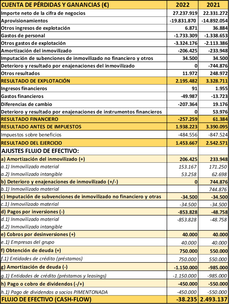 Como podemos ver en la tabla 4, a pesar de que PIMENTONADA presenta en 2022 un resultado del ejercicio elevado, su flujo de efectivo es negativo. Esto se explica porque los elementos que minoran el resultado superan a los que lo aumentan. Las reducciones más relevantes han sido las siguientes: